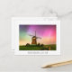 Photo postcard of a traditional windmill under a colorful sky with Northern Lights (aurora borealis) and stars at night in the countryside at Leidschendam in the Netherlands (Europe), with a white border and the text 'Netherlands'.