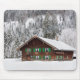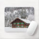 Mousepad with a traditional wooden log cabin house with green shutters in a forest in the snow in winter in Bavaria at the border between Germany and Austria.