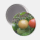 This beautiful magnet features a photograph of a bunch of ripening tomatoes including a red, orange and green cherry tomato in a line, growing on a tomato plant in a suburban garden. The photograph was taken using macro photography for a detailed result.