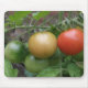 This beautiful mousepad features a photograph of a bunch of ripening tomatoes including a red, orange and green cherry tomato in a line, growing on a tomato plant in a suburban garden. The photograph was taken using macro photography for a detailed result.