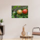 This beautiful poster features a photograph of a bunch of ripening tomatoes including a red, orange and green cherry tomato in a line, growing on a tomato plant in a suburban garden. The photograph was taken using macro photography for a detailed result.