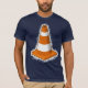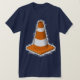 A bright orange traffic safety cone on white splatted paint. White splatted paint only shows on dark apparel.