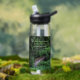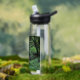Stay quenched wherever you go with this clear, plastic water bottle that features the photo image of a hiking trail leading into a deep forest over a wooden footbridge along with an inspiring quote by naturalist John Muir and printed in green lettering that reads, "And into the forest I go to lose my mind and find my soul." Select your water bottle size and colour. NOTE: Design not optimised for child's water bottle style.