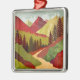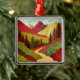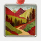 An abstract landscape with unique textures showing a mountain landscape with a hiking trail and trees and beautiful sunrays in shades of red, crimson, yellow, and green.