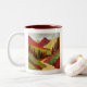 An abstract landscape with unique textures showing a mountain landscape with a hiking trail and trees and beautiful sunrays in shades of red, crimson, yellow, and green.
