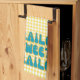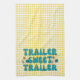 Cute kitchen towels for those embracing the trailer life! Aqua "trailer sweet trailer" text with added flowers on yellow harlequin pattern background