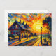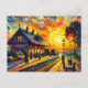 The image depicts a vibrant and colourful painting of a train station at what appears to be sunset or sunrise. The sky is filled with swirling patterns of yellow, orange, blue, and red hues that reflect onto the railway tracks and the station platform. The station building is labelled “Bahnhoft,” and there are several figures on the platform, some standing and some walking. Trees line one side of the tracks, bending slightly as if blown by the wind. The style is reminiscent of Vincent van Gogh’s post-impressionist works, with bold colours and dynamic brush strokes creating a sense of movement throughout the scene.