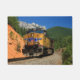 A photograph of a train passing below Castle Crags in the Sacramento River Canyon.