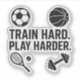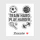 Add instant motivation with this “Train Hard. Play Harder.” sports sticker. Features sports icons for soccer, basketball, tennis, and gym. Perfect for laptops, bottles, and gear bags.