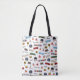 Add a cute train theme to your child's day with this custom railroad pattern tote bag. Tote bag has trains, train tracks, railroad signs, and gates. Add the first name of your little kid for a personal touch. The Choo Choo text is also editable.