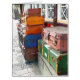 A simple watercolor design of a train station during wartime. Suitcases stacked on the platform waiting for the steam train to transport them to their destination. England.