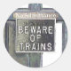 An art design of old door of the booking office on the train station platform with a warning of no admittance and beware of the trains from the steam train era.