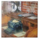 Designs by Susan Savad -- The station master was the person in charge of the railway station. This quaint station master's office contains an old fashioned typewriter and an vintage fan with blades on a wooden desk with cubbyholes.