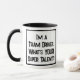 Funny slogan on a mug that says "I'm a Tram Driver. what's YOUR super talent?". Two Tone Mug for a Tram Driver. Black and white bold text.