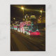 Postcard with photo of tram decorated as a train with red, green, yellow and white lights in Blackpool as part of annual illuminations