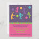 A fun and colourful trampoline birthday party invitations. The colours purple, pink, green and blue. The design features silhouettes of girls jumping into the air around balloons and confetti. Great to use for a trampoline party or any celebration that is fun enough for girls to jump into the air. Could be used for kids and teenagers.