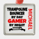 This custom ornament featuring the quote "Trampoline Bouncer by Day Gamer by Night" is perfect for any trampoline bouncer that loves playing video games.