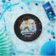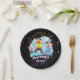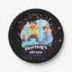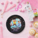 Bright glitter stars trampoline birthday party paper plates for boys or girls birthday- Multicolored, silver, purple and pink glitter look stars scattered all around. Fun drawing of happy kids jumping. Curved, personalised name and 'birthday' in funky style letters below. Solid black background colour, which may be changed to suit your birthday party colours or special event. Fun stars jump birthday party favour stickers. Note: All images are printed. Not actual glitter. We have more bounce house party decor and big air birthday party supplies in our Zazzle.com/angela65* shop, including matching trampoline birthday party invitations and jump party favour stickers. Click Customise option to change text colours, size, and font styles to match your kids party decor.