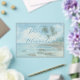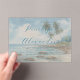 This elegant wedding invitation features a serene beach scene with palm trees and a soft blue sky, creating a tranquil tropical vibe. The muted blues, greens, and sandy beige tones evoke a peaceful atmosphere, enhanced by the watercolor painting technique that gives the design a dreamy quality. The layout is vertically orientated with centrally aligned text in an elegant script font for names and a classic serif font for details, ensuring a formal and romantic theme. Perfect for couples seeking a sophisticated yet relaxed celebration, this invitation sets the tone for a memorable event with its representation of a coastal landscape.
