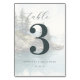 This wedding table card features a serene lakeside scene with rocky shores and evergreen trees, rendered in a soft watercolor style. The design uses a calming colour palette of light blue and grey, complemented by bold dark teal typography for the table number "3" and elegant cursive script above it. Customisable text fields allow for personalisation with names and dates, making it perfect for adding a touch of nature-inspired elegance to your event. The overall mood is tranquil and inviting, ideal for creating a sophisticated atmosphere at your special occasion.