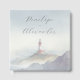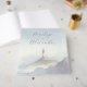 This wedding guest book cover features a serene watercolor design of a lighthouse on a rocky outcrop, evoking a misty coastal atmosphere. The soft blue and grey palette is accented with touches of muted red for the lighthouse and hints of green foliage, creating a romantic and nostalgic feel. Elegant script typography adds a personal touch above the illustration, while scattered gold stars and confetti-like shapes bring a whimsical celebration vibe. Perfect for capturing memories at a seaside-themed wedding, this design combines tranquillity with a sense of adventure.