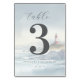 This table number features a serene coastal scene with a prominent lighthouse, rendered in soft pastels and cool tones of light blue, grey, and hints of pink. The design showcases an elegant cursive script for the word "table" above a bold numeral "3," creating a harmonious visual hierarchy. With a romantic and vintage aesthetic, this watercolor-style illustration evokes a tranquil oceanic atmosphere, perfect for adding a touch of nostalgia to your event decor. Customisable placeholders allow for personalisation, making it ideal for weddings or intimate gatherings.