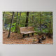 A solitary bench sits amid a forest with fallen leaves covering the ground, creating a peaceful setting. Tall trees surround the area, providing a serene natural backdrop. Photo taken at Look Park Northampton Ma.