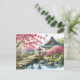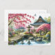 A serene Japanese garden during dusk, featuring a traditional wooden house with a gently sloping roof. Soft light emanates from the windows, casting a warm glow on the surrounding cherry blossom trees, which are in full bloom with vibrant pink flowers. A small stone path leads to an arched wooden bridge spanning a tranquil pond, reflecting the colourful landscape. Lanterns line the path, adding to the peaceful atmosphere, while delicate birds fly in the twilight sky. In the distance, more traditional structures are visible, adding depth to the scenic view.