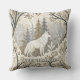 This serene winter forest throw pillow features a majestic white wolf at its centre, surrounded by snow-dusted trees in soft tones of cream, brown, grey, and pale blue. A second wolf is subtly nestled in the lower corner, hinting at unseen life within the quiet woodland. With a mix of bare-branched and evergreen trees, framed by delicate decorative elements, this design evokes natural beauty, stillness, and a touch of winter magic. Perfect for nature lovers, animal enthusiasts, and seasonal or fantasy-themed settings.