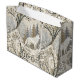 This serene winter forest gift bag features a majestic white wolf at its centre, surrounded by snow-dusted trees in soft tones of cream, brown, grey, and pale blue. A second wolf is subtly nestled in the lower corner, hinting at unseen life within the quiet woodland. With a mix of bare-branched and evergreen trees, framed by delicate decorative elements, this design evokes natural beauty, stillness, and a touch of winter magic. Perfect for nature lovers, animal enthusiasts, and seasonal or fantasy-themed settings.