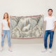 This serene winter forest blanket features a majestic white wolf at its centre, surrounded by snow-dusted trees in soft tones of cream, brown, grey, and pale blue. A second wolf is subtly nestled in the lower corner, hinting at unseen life within the quiet woodland. With a mix of bare-branched and evergreen trees, framed by delicate decorative elements, this design evokes natural beauty, stillness, and a touch of winter magic. Perfect for nature lovers, animal enthusiasts, and seasonal or fantasy-themed settings.