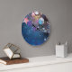 This wall round wall clock is meant to give a room a peaceful feel with the deep blues that are in it and the the soft small lit candles that are on it and the stars give a restful effect. The art was created using a computer with digital software.