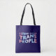 Show your support for the trans community with this navy tote bag featuring the words "I Stand with Trans People" in the trans flag colours.
