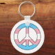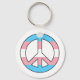 Basic Button Keychain with peace symbol design in colours of transgender flag pride flag, rainbow stripes pride flag, on white background