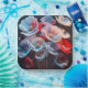 A collection of stylised poppies with translucent petals in shades of blue, red, and white on a black background