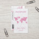 Passport Travel Agency Glitter Gold World Map Boarding Pass Business Card with pink background for makeup artist, lash extension, event planner, travel agent, hair stylist, nail artist