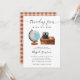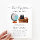 Travel theme bridal shower invitation card featuring illustration of vintage suitcase, camera, and a globe. The text says "travelling from Miss to Mrs."