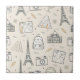 Playful travel-themed pattern ceramic tile featuring Eiffel Tower illustrations, cameras, backpacks, globes, and maps in a hand-drawn doodle style. Ideal for travelers, adventure seekers, travel lovers, and anyone who loves wanderlust-inspired aesthetics.