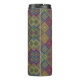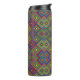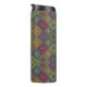 Travel mug with vibrant geometric pattern. Colorful diamond shapes in various sizes cover the surface. Seen from front and right side views.