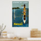 Vintage travel poster for United Air Lines to Hawaii, showing people paddling an outrigger canoe, circa 1960. In the background, Diamond Head and Waikiki Beach.
