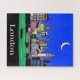 Puzzle in a vibrant cityscape of London is depicted under a starry night sky, with iconic landmarks like Big Ben silhouetted against the blue. A crescent moon hangs above the skyline, while a bridge crosses the river.