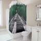 Shower curtain with a closeup of railroad tracks through pine trees. Customisable. Modern, chic, and classic, the perfect shower curtain for any bathroom.