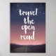 Travel the open road inspirational travel quote or a road leading into the distance during a warm sunset.