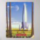 Travel the Universe vintage space art travel poster of a classic silver 1950s space rocket ready for a trip to the distant moon.