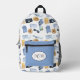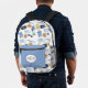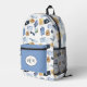 The perfect backpack for the traveller. Set on a white background, this pattern has a pattern of several travel items. In the front there’s a zipper pouch with you can customise by adding a monogram and changing the colour.