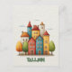 This travel postcard showcases a charming illustration of a colorful cityscape featuring whimsical houses with various shapes and vibrant colors similar to the beautiful capital of Estonia, Tallinn.