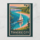 Traverse City retro vector travel design. Traverse City, Michigan, is a charming lakeside destination known as the Cherry Capital of the World, offering visitors vineyards, sandy Lake Michigan beaches, and scenic landscapes.