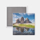 Photo magnet with the famous three peaks of the Tre Cime di Lavaredo or Drei Zinnen Dolomites mountain with reflection in the water of a puddle on a beautiful day in South Tyrol/Trentino Alto-Adige in Northern Italy with the text 'Tre Cime di Lavaredo, Italy'.