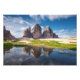 Photo print of the famous three peaks of the Tre Cime di Lavaredo or Drei Zinnen Dolomites mountain with reflection in the water of a puddle on a beautiful day in South Tyrol/Trentino Alto-Adige in Northern Italy.