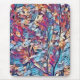 An abstract art design of a small woodland tree in blues, reds and brown colours.